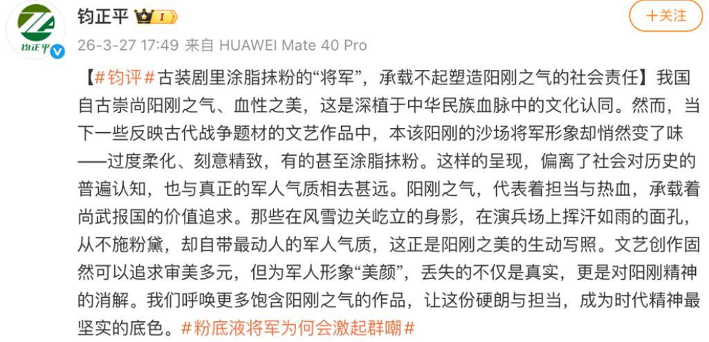 这事儿闹到最后,连钧正平都下场了,直接发文说:“古装剧里涂脂抹粉的‘将军’,承载不起塑造阳刚之气的社会责任。”